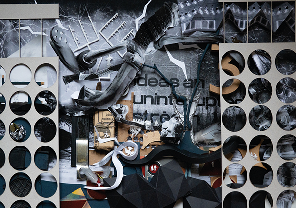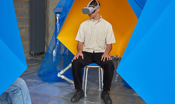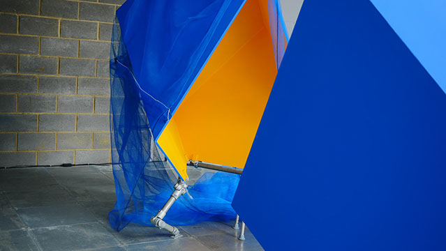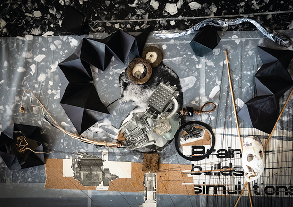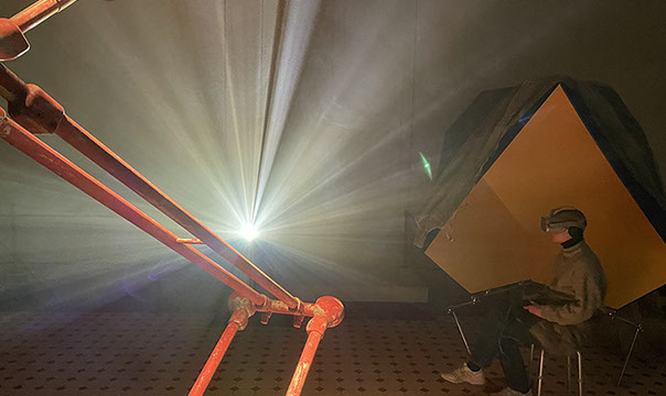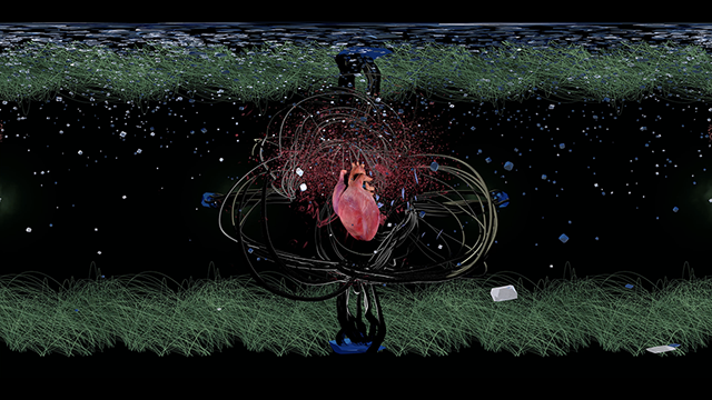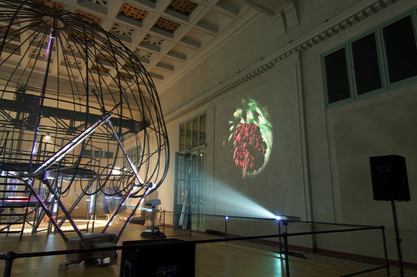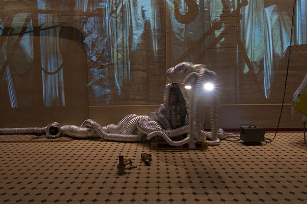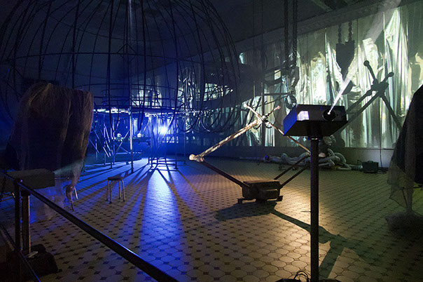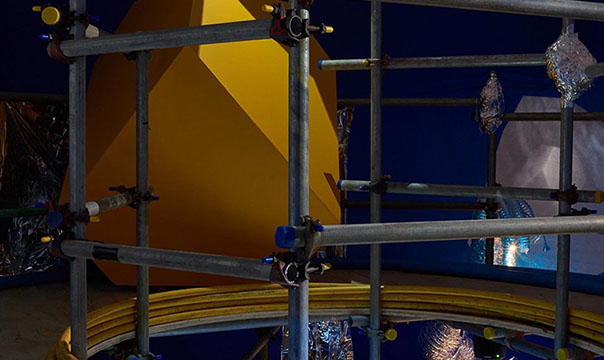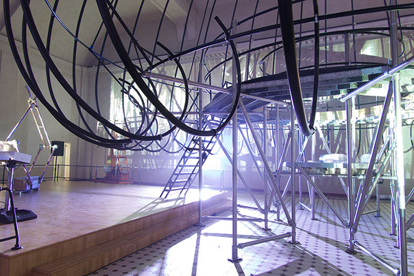 Materials: a programmed robot, silver pipe, surround sound, scaffolding poles, fiberglass satellite dish, surround sound 5.1, 7 projections, 6 VR headsets inside a polyhedron form. A programmed roving light, mylar curtains, a solid polyhedron in mdf.