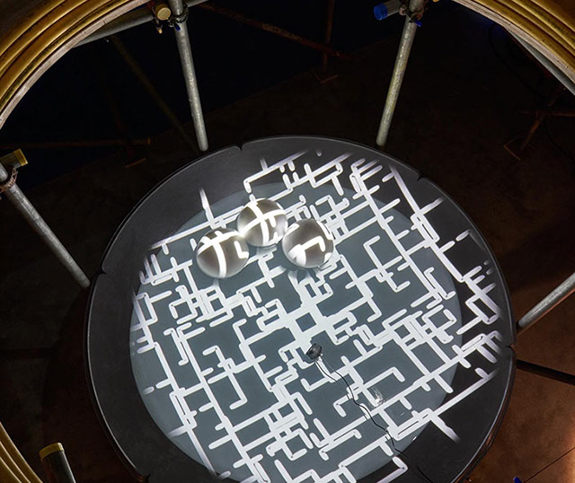 Materials: a programmed robot, silver pipe, surround sound, scaffolding poles, surround sound 5.1, 5 projections, smoke machine, a programmed roving light, mylar curtains.