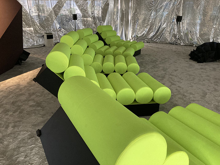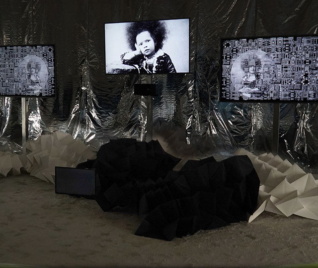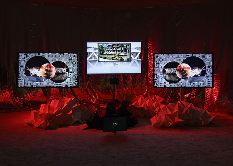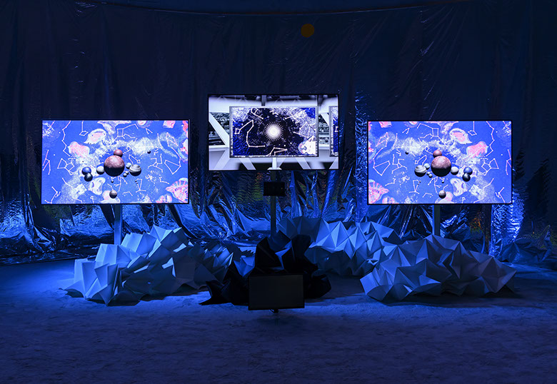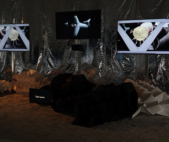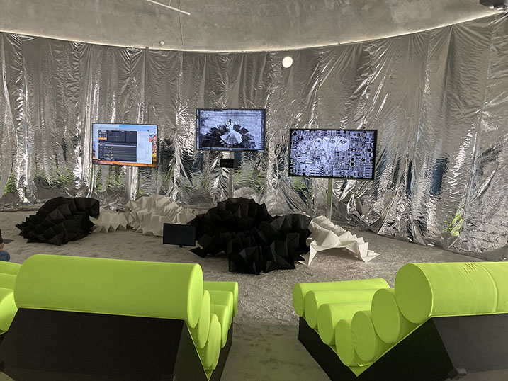 Materials: 3 synchronised monitors, 5.1 surround sound, mylar curtain, 6 geometric forms, folded paper, seating and carpet.