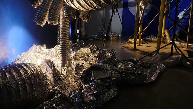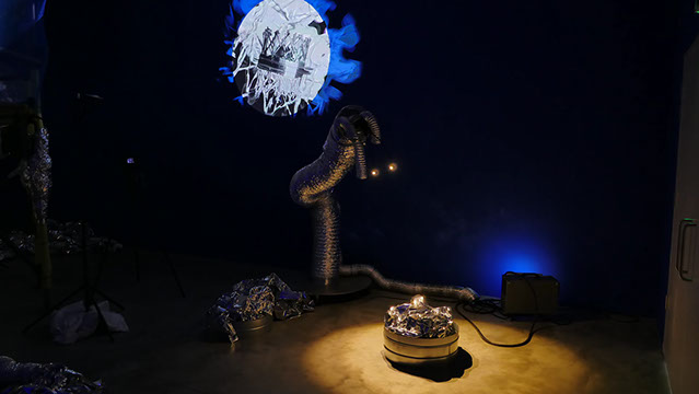 Materials: a programmed robot, silver pipe, surround sound, scaffolding poles, fiberglass satellite dish, surround sound 5.1, 7 projections, smoke machine, 3 VR headsets inside a polyhedron form. A programmed roving light, mylar curtains, a solid polyhedron in mdf.