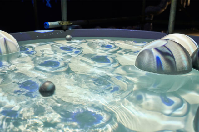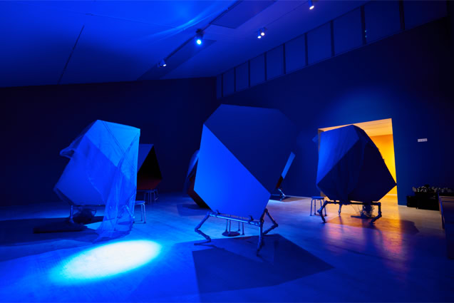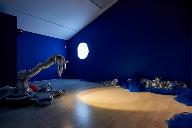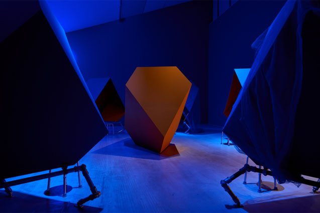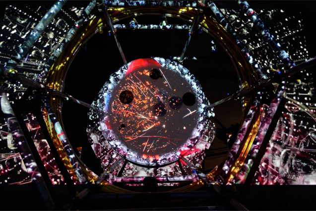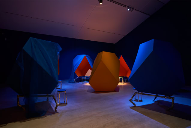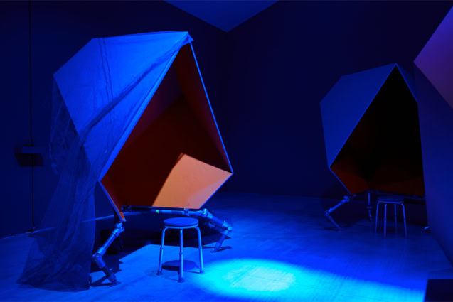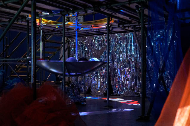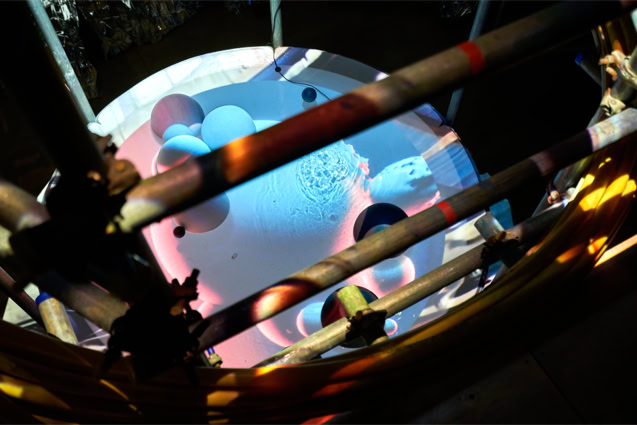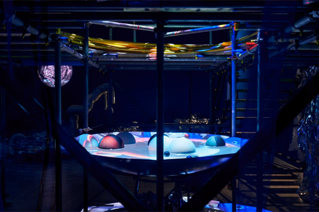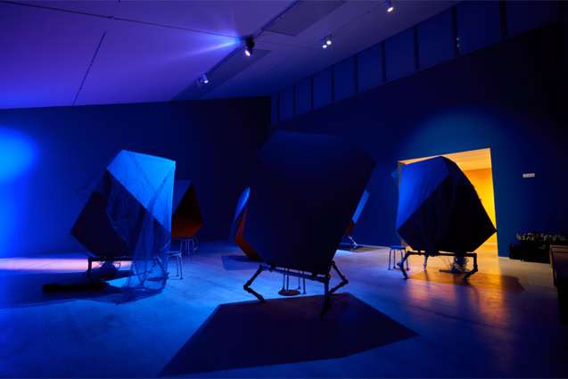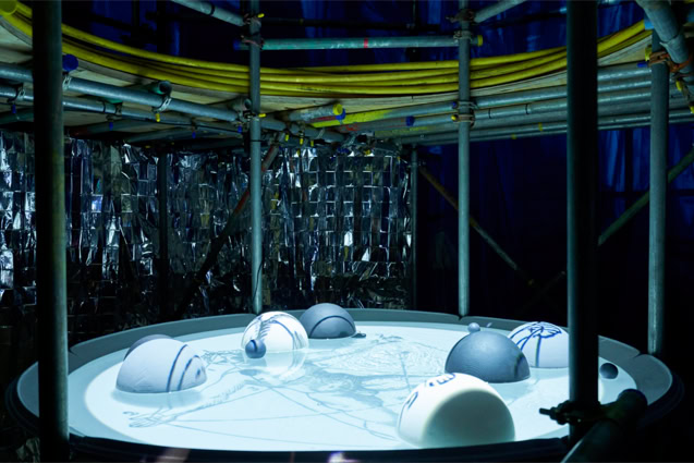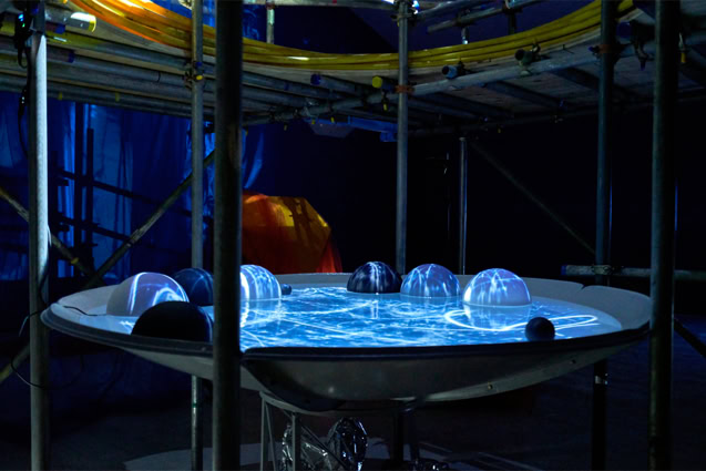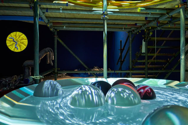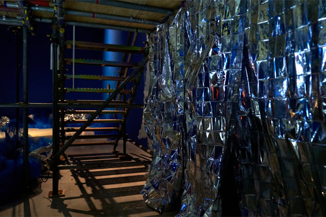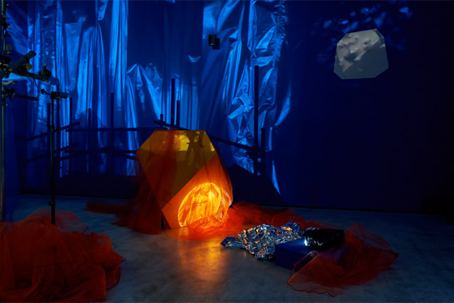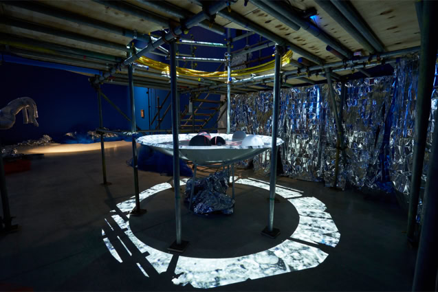Materials: projections x 5, surround and stereo sound, an industrial robot, folded paper, spheres, fans x 2, mylar, silver bubble wrap, media players, framed collages x 3.