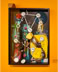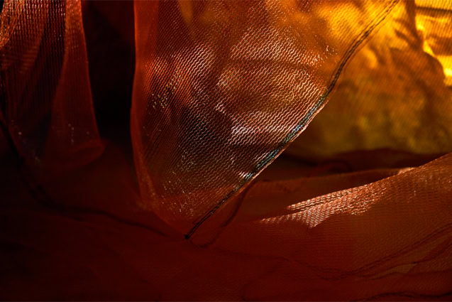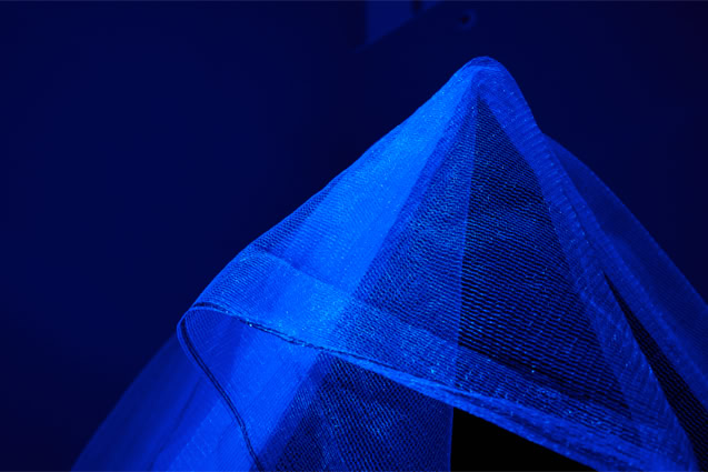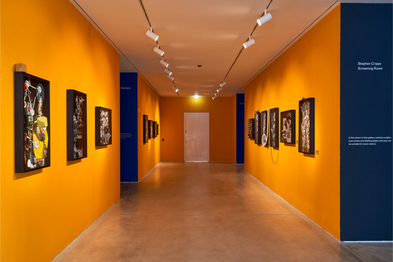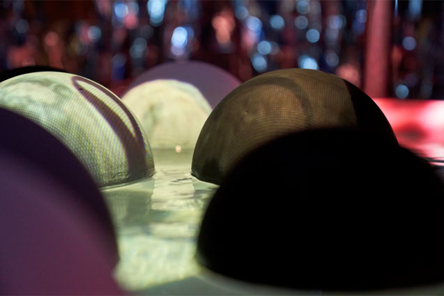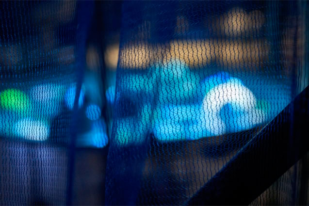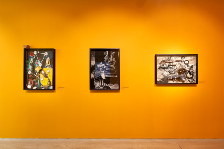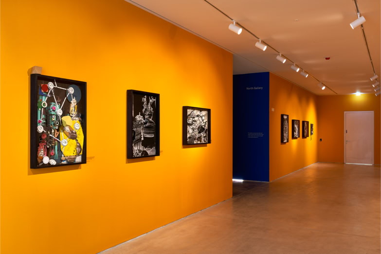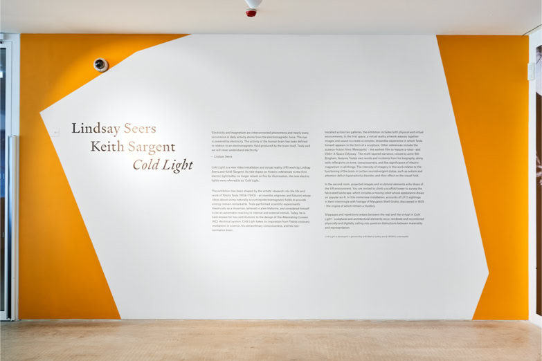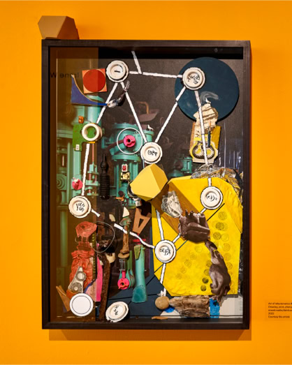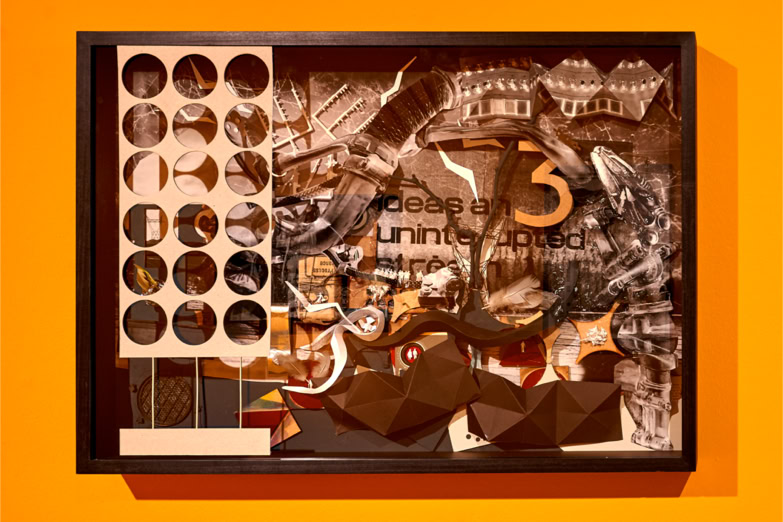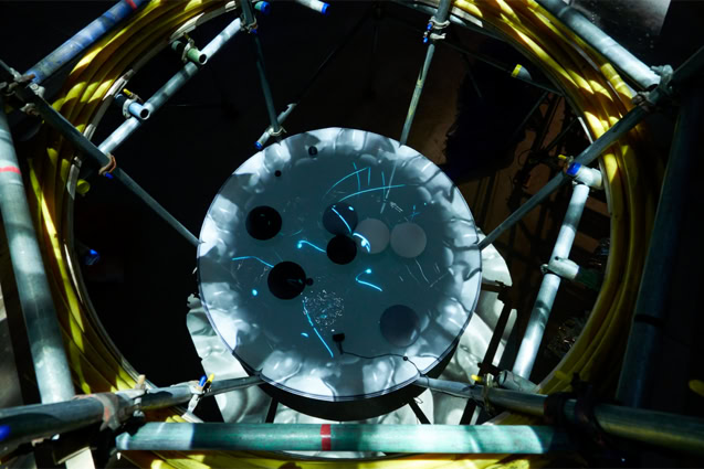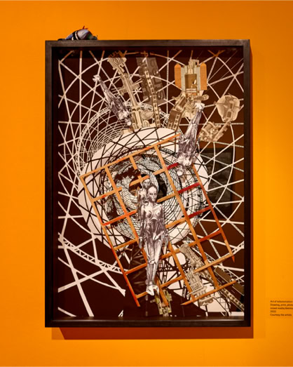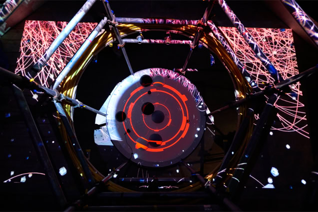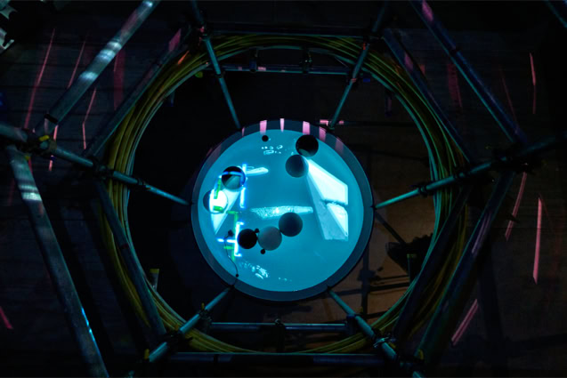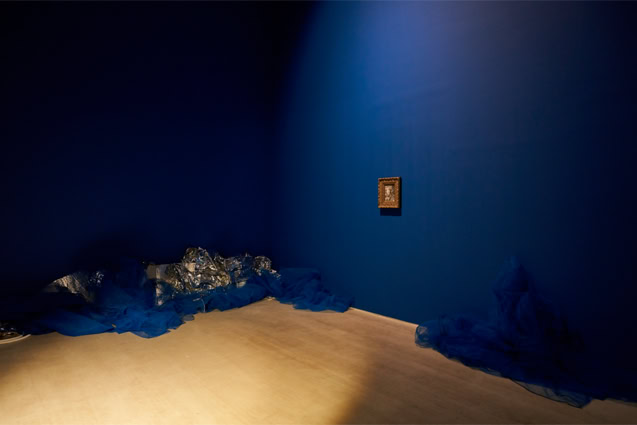 Materials: projections x 5, surround and stereo sound, an industrial robot, folded paper, spheres, fans x 2, mylar, silver bubble wrap, media players, framed collages x 3.
