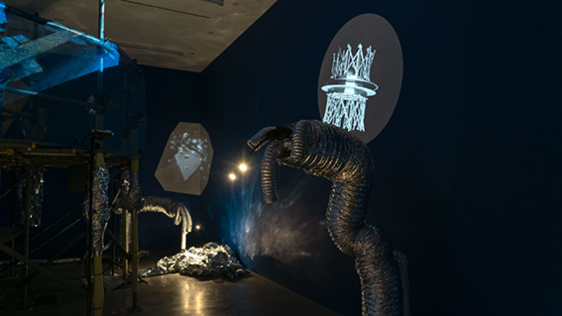 Materials: projections x 5, surround and stereo sound, an industrial robot, folded paper, spheres, fans x 2, mylar, silver bubble wrap, media players, framed collages x 3.
