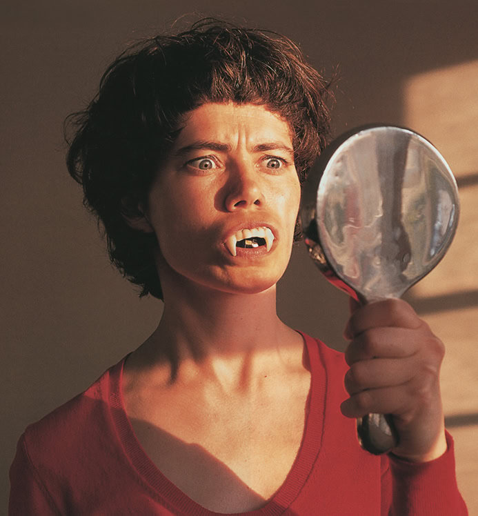 In Vamp(yre) Reality the portraits from an album found in a hidden bookshop in Riga are speaking, being brought to life by AI. The speaking photographs are not silenced by an image as Seers own process.. It was unprecedented at that time. When working with ‘being a human camera’, the process involves her using a mouth as a camera by putting photographic paper in her mouth and exposing it either with the shape of the mouth as in a kiss. It is the case that even as we form our lips into a kiss an image is thrown upside down on our throat in an act of image cannibalism). She also used a mouth guard with a pinhole in it – a Plato’s cave of sorts. She has a black sack that she wears to protect the photographic paper. Images she made with colour paper were turned red with light passing through the blood of the cheeks. This is vampiric – she becomes a blood sucking monster …