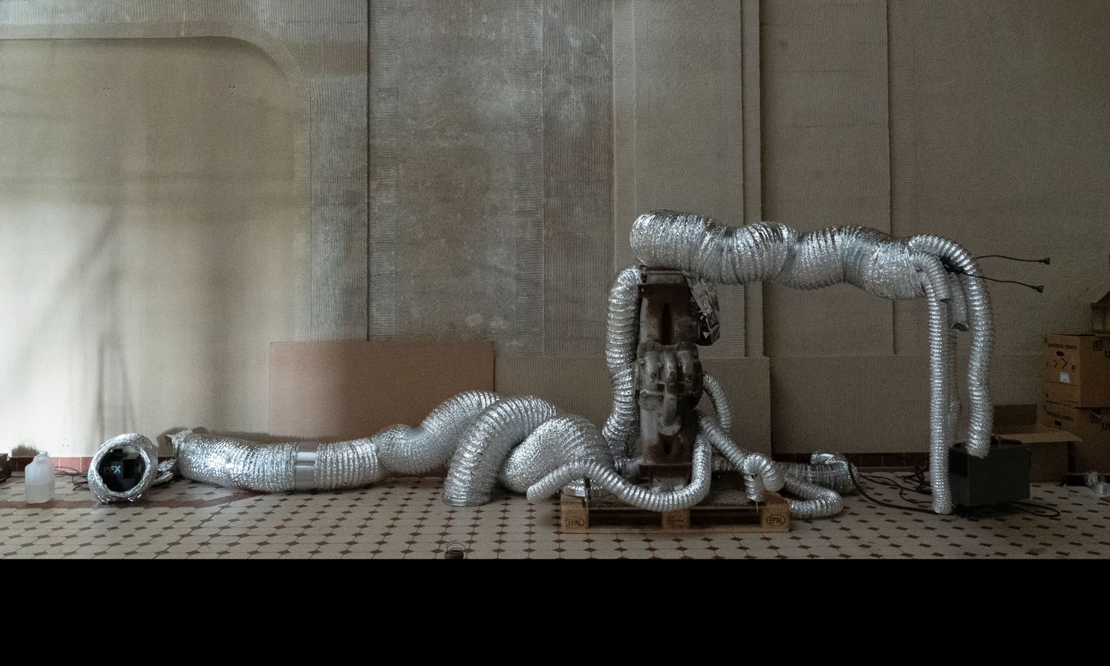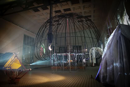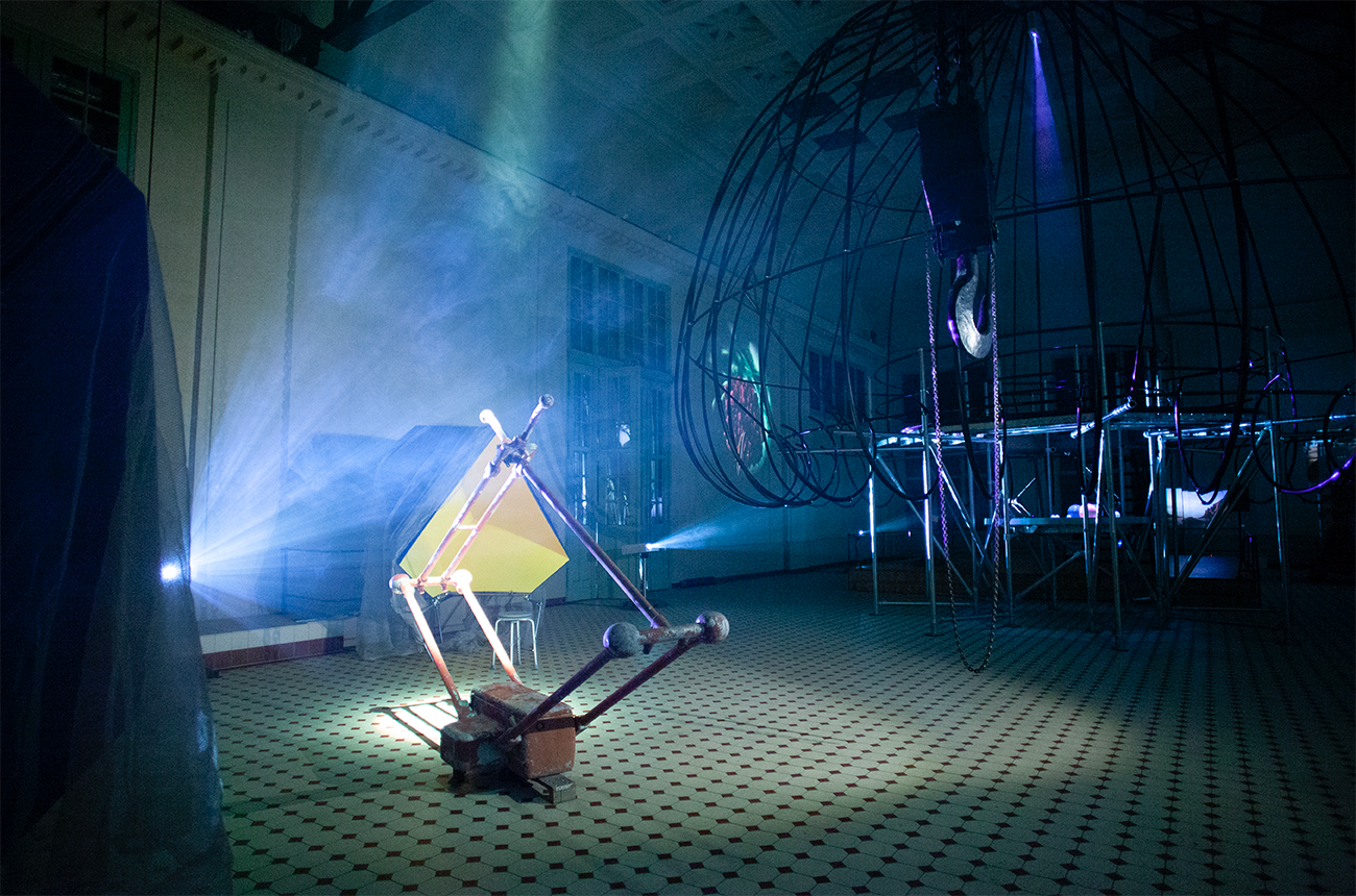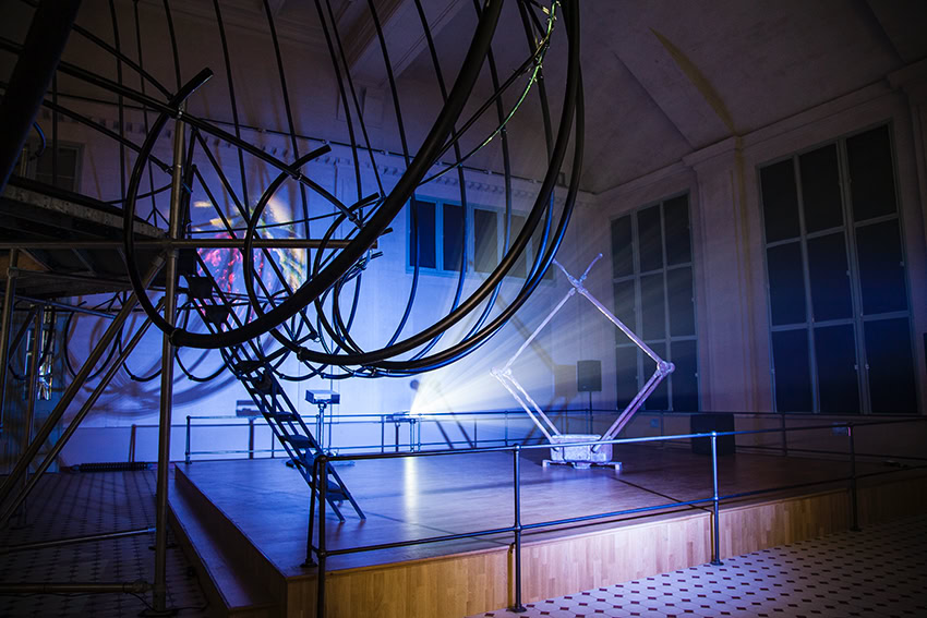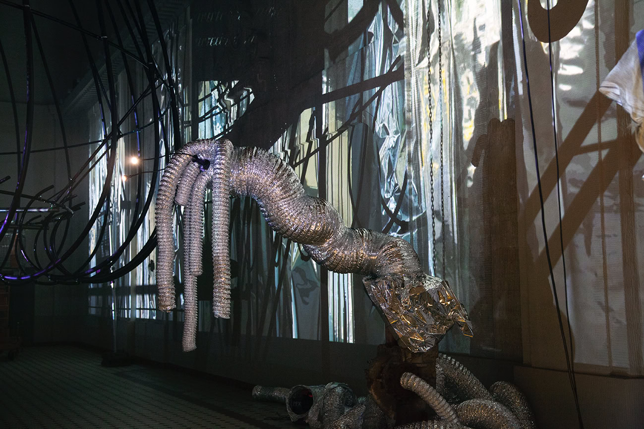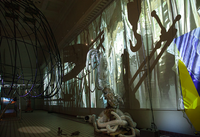 Materials: projections x 5, surround and stereo sound, an industrial robot, folded paper, spheres, fans x 2, mylar, silver bubble wrap, media players, framed collages x 3.
