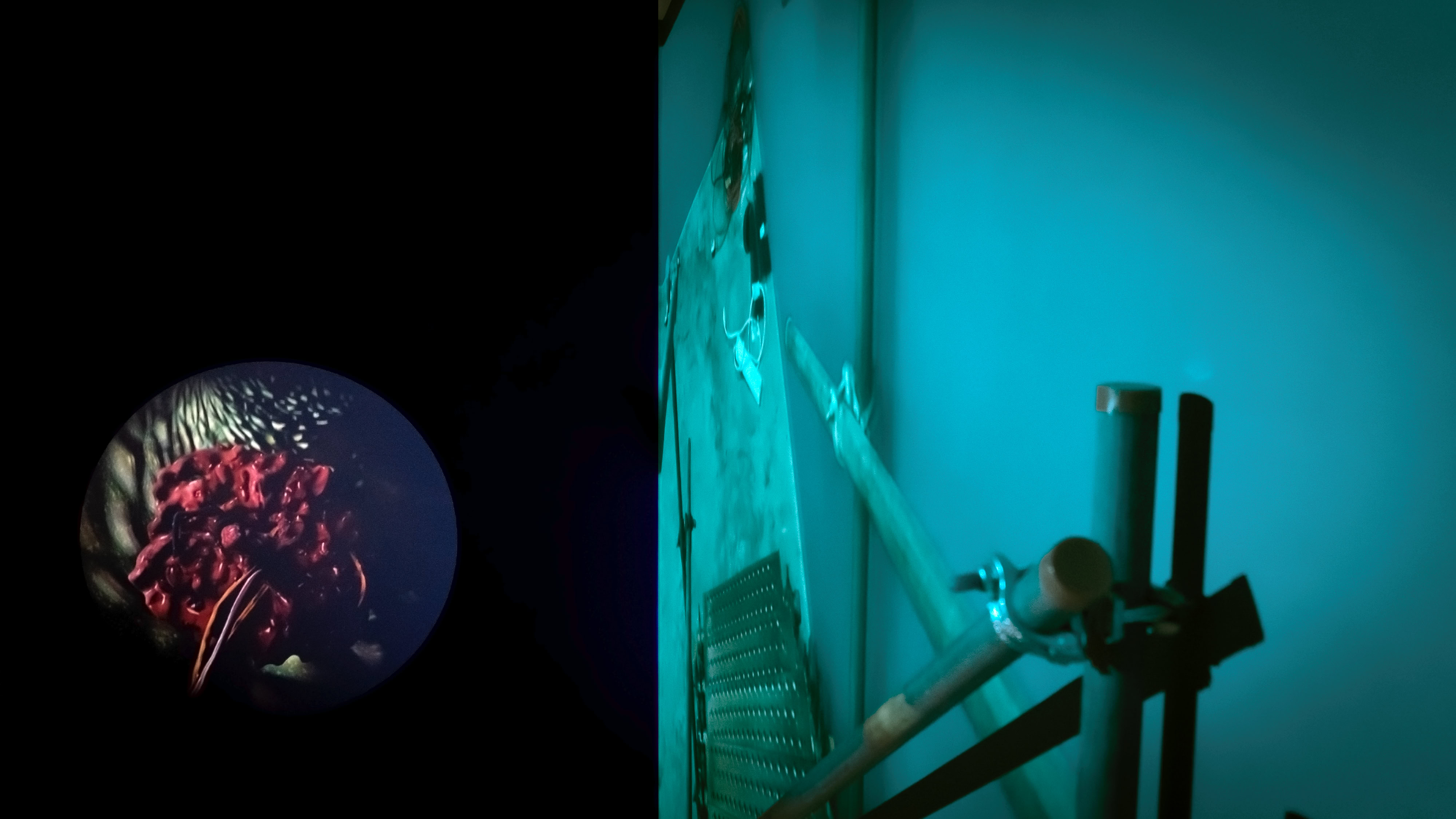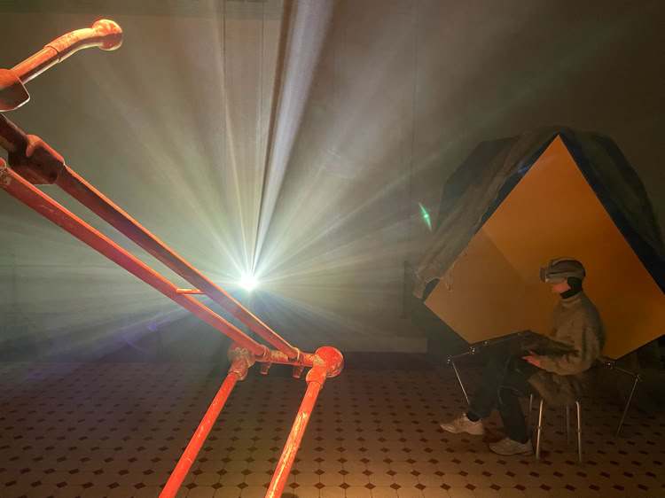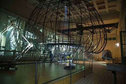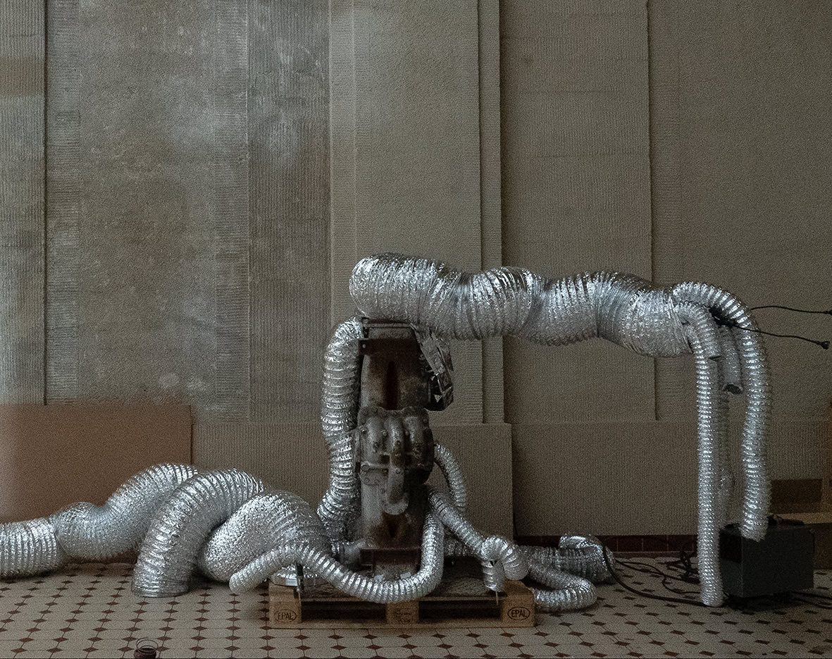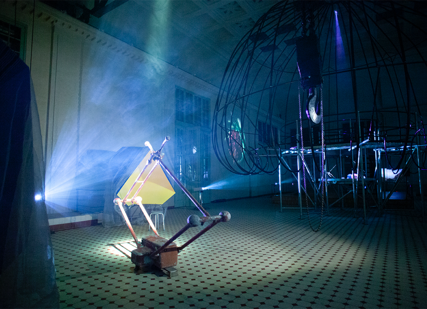 Materials: projections x 5, surround and stereo sound, an industrial robot, folded paper, spheres, fans x 2, mylar, silver bubble wrap, media players, framed collages x 3.