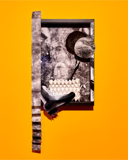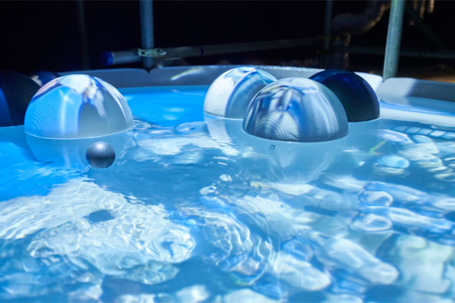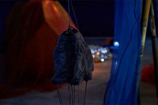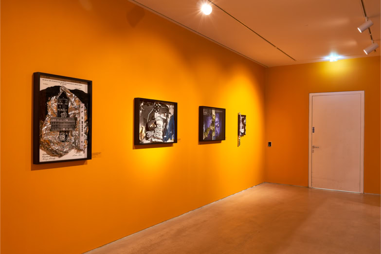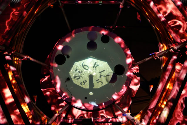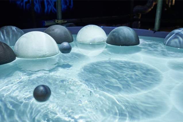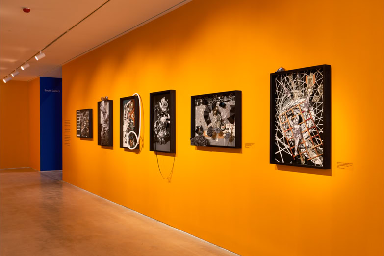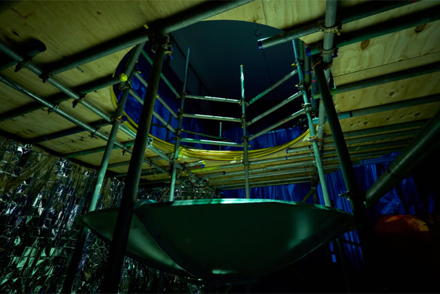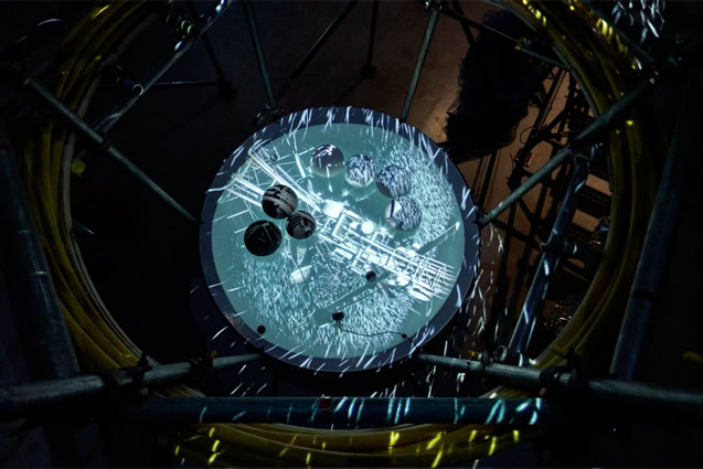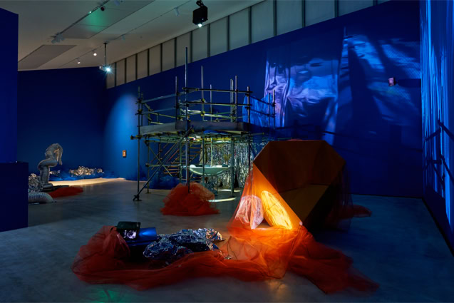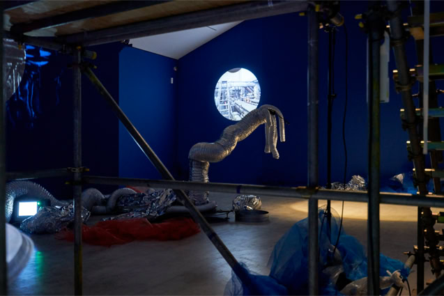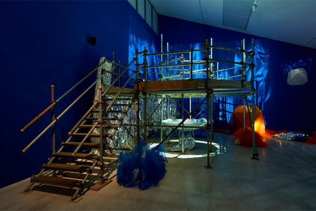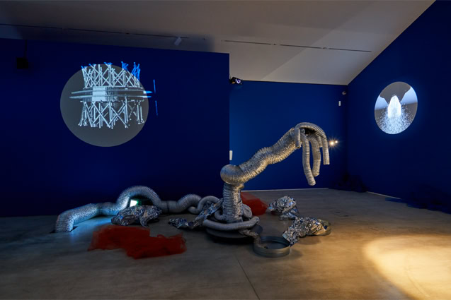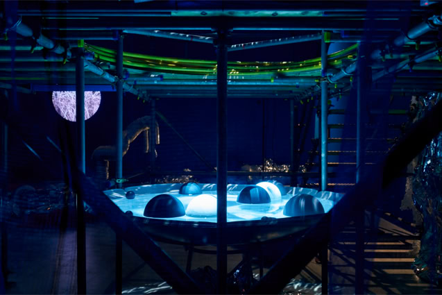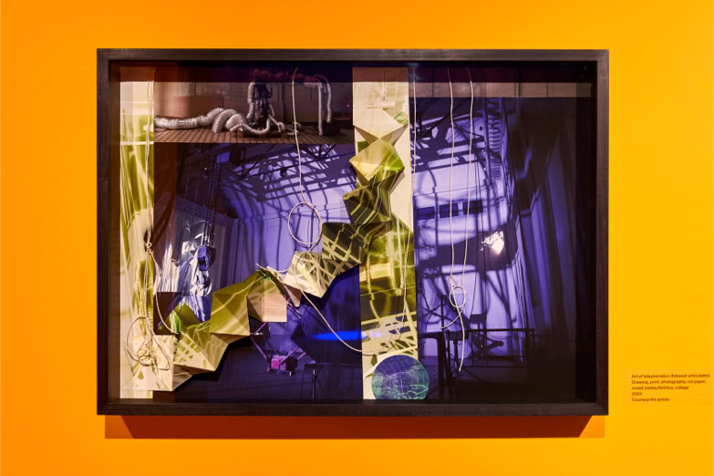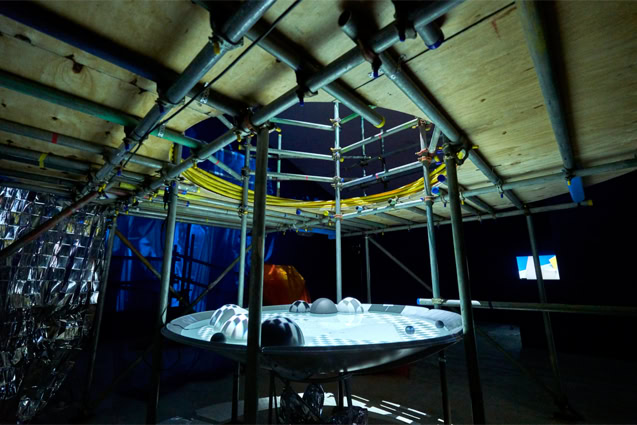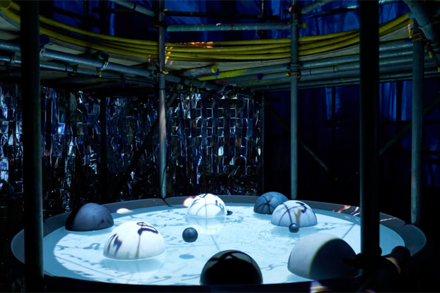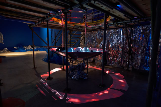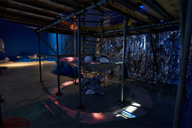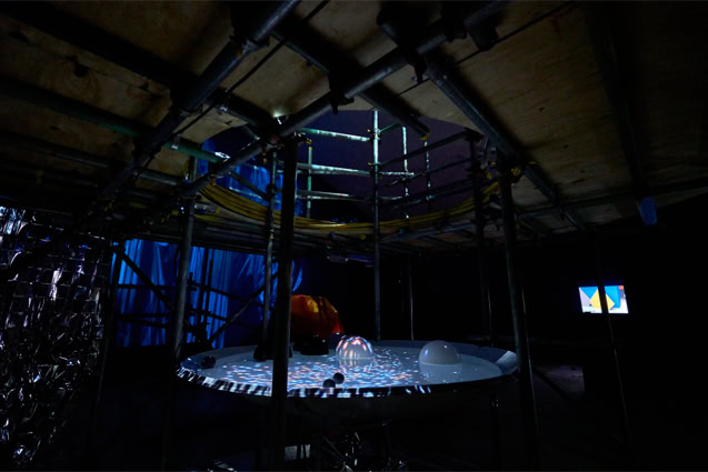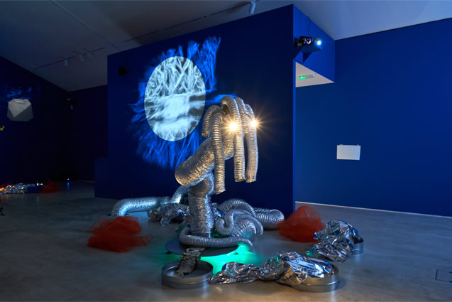 Materials: projections x 5, surround and stereo sound, an industrial robot, folded paper, spheres, fans x 2, mylar, silver bubble wrap, media players, framed collages x 3.