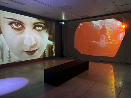 Materials: photographs, gauze screen, VR, AI, 3 video projections, roving light and a sound track